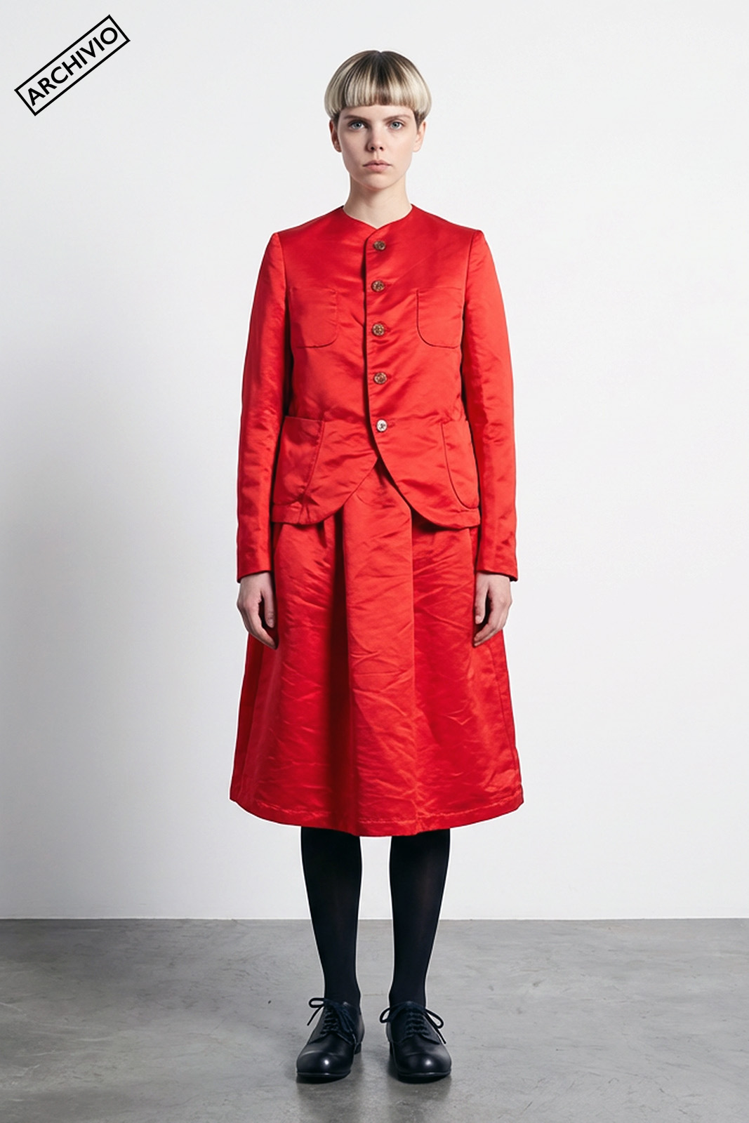 CDG Girl. Red Polyester Jacket + Skirt.