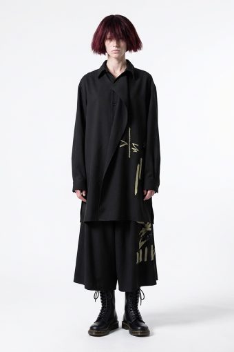 Yohji Yamamoto – Y’s. Wide black wool shirt with print.